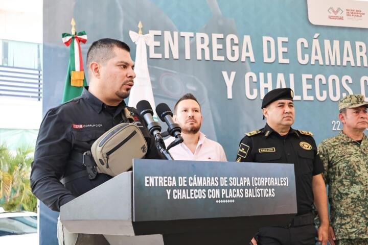 Eduardo Ramírez entrega cámaras corporales y chalecos con placas balísticas a elementos de la SSP
