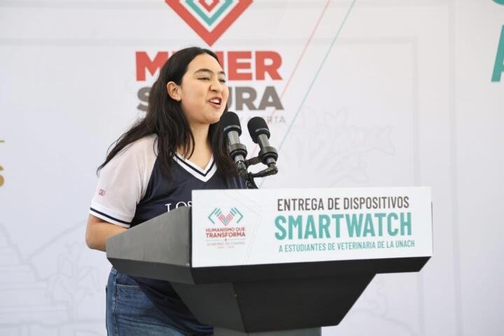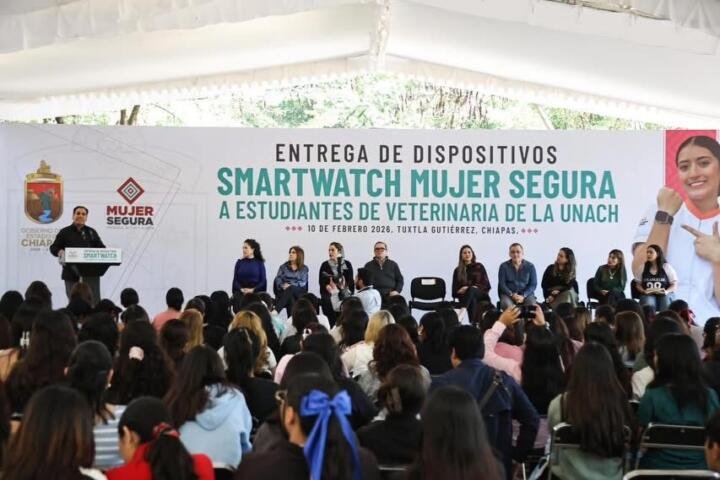 El gobernador Eduardo Ramírez Aguilar encabezó la entrega de dispositivos smartwatch del programa Mujer Segura: Presiona, Activa y Alerta a estudiantes de la Escuela de Medicina Veterinaria y Zootecnia de la Benemérita Universidad Autónoma de Chiapas (Unach), en Tuxtla Gutiérrez. En ese marco, destacó que una de las prioridades del gobierno de la Nueva ERA es garantizar el bienestar, la seguridad, la confianza y el derecho de las mujeres a una vida libre de violencia.