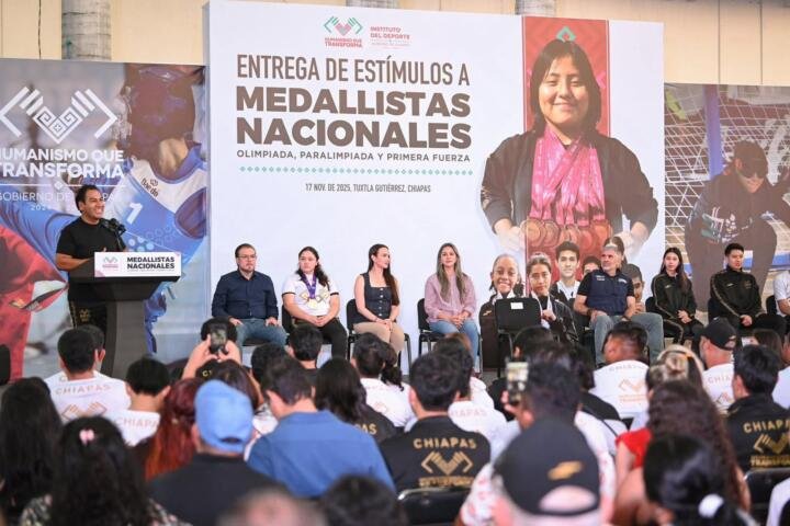 El gobernador Eduardo Ramírez Aguilar entregó estímulos a las y los medallistas nacionales de Olimpiada, Paralimpiada y Primera Fuerza 2025, a quienes felicitó por los destacados resultados obtenidos en los Juegos Conade 2025. Refrendó además el compromiso del gobierno de la Nueva ERA de respaldar a las y los atletas chiapanecos para que alcancen sus metas deportivas y continúen poniendo en alto el nombre de Chiapas.